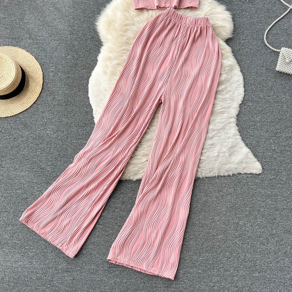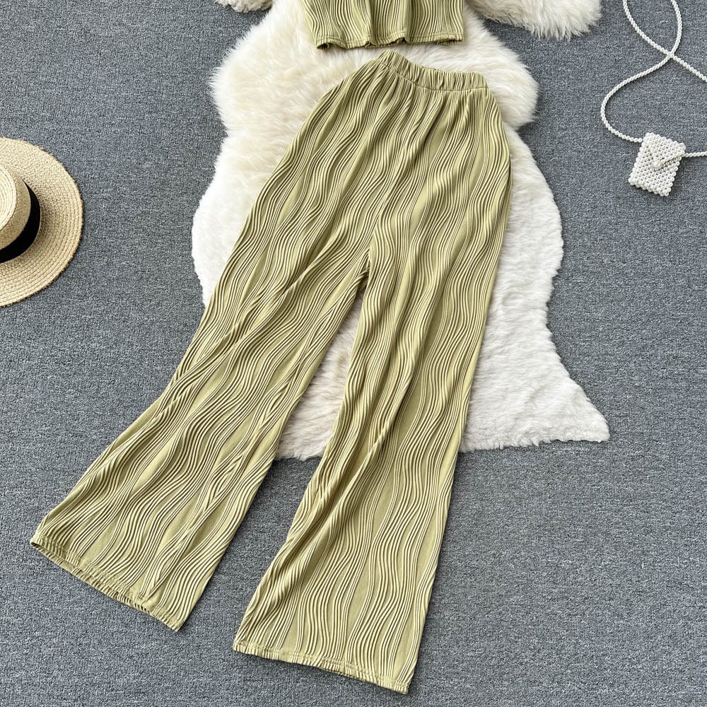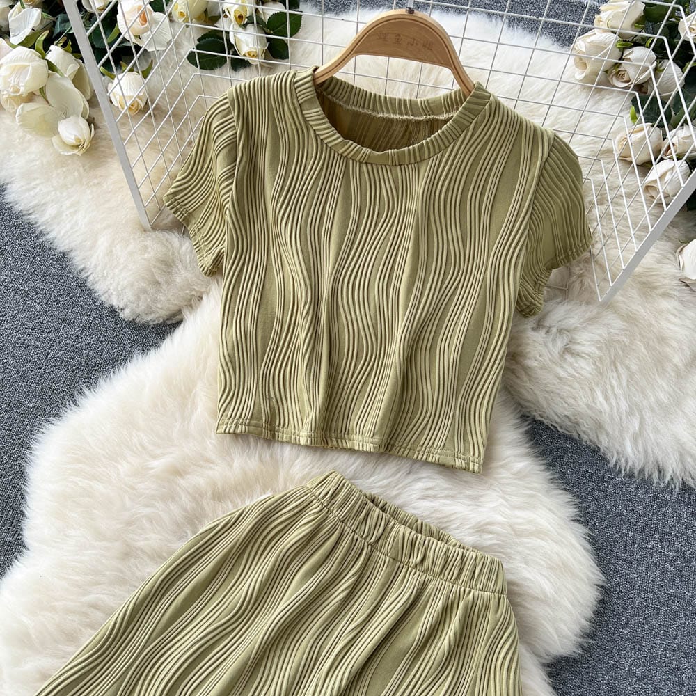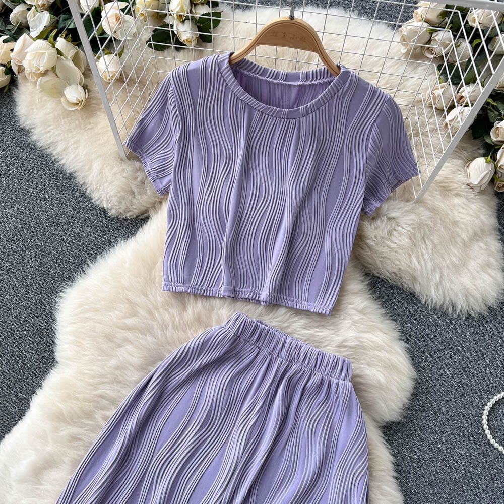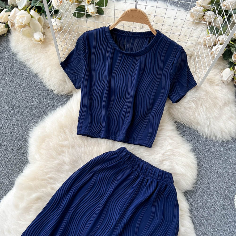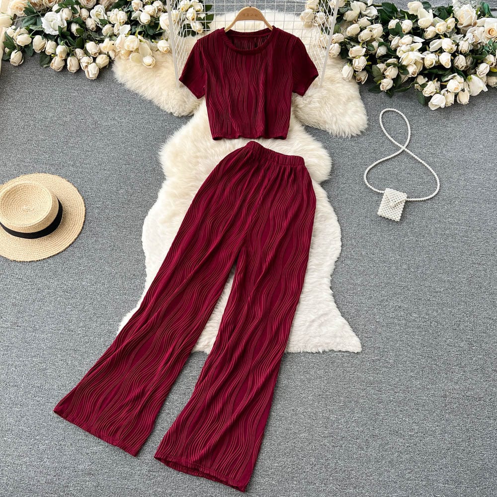 Es handelt sich um ein Set aus einem lockeren T-Shirt mit Rundhalsausschnitt und weiten langen Hosen. Es bietet eine entspannte Passform und atmungsaktiven Stoff, der den ganzen Tag über Komfort unter der Sonne gewährleistet. Das minimalistische Design passt nahtlos zu den weiten langen Hosen, die mit einer fließenden Silhouette jede Figur schmeicheln.