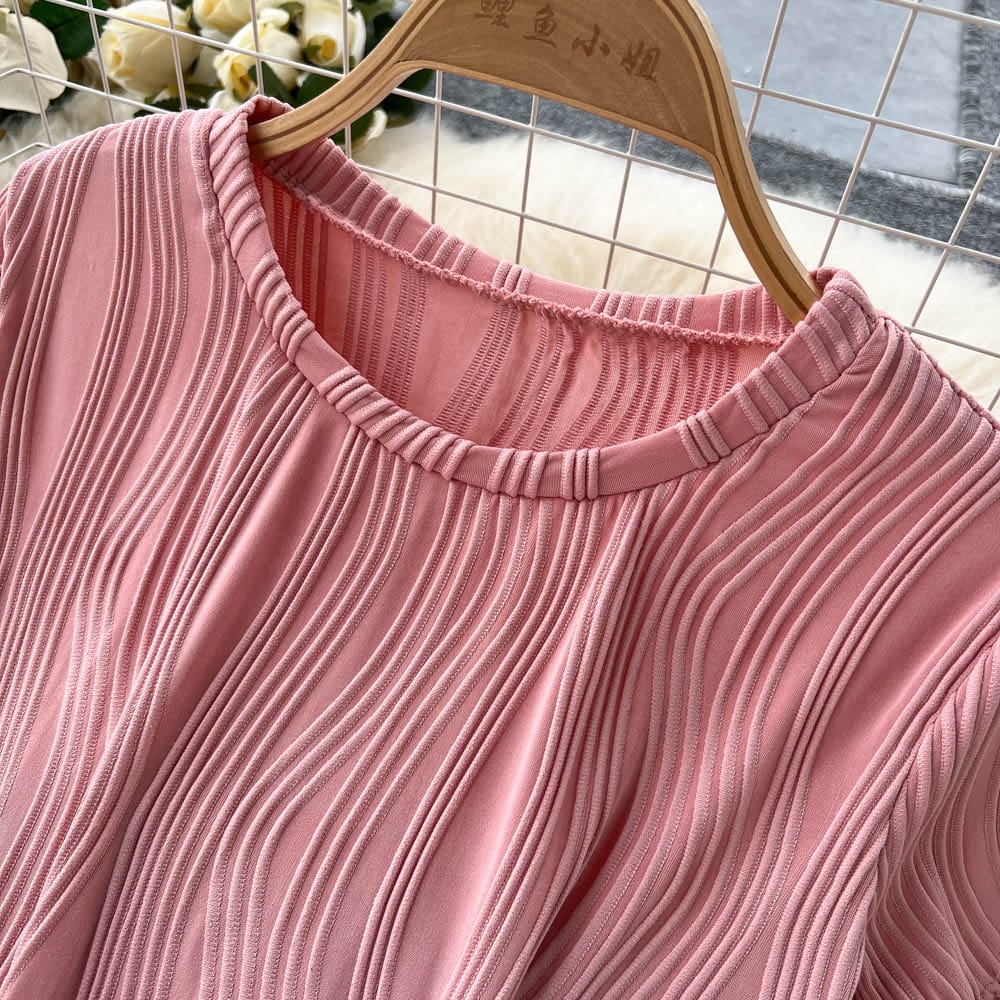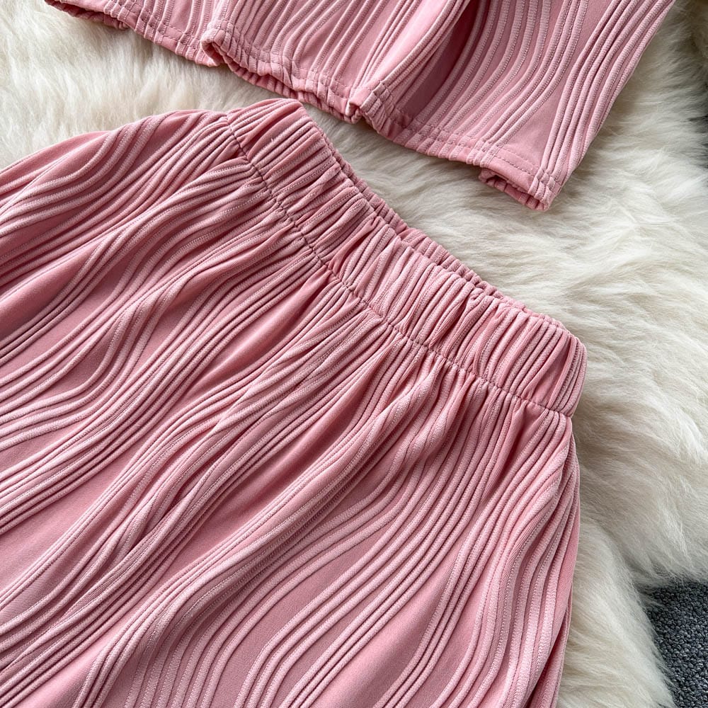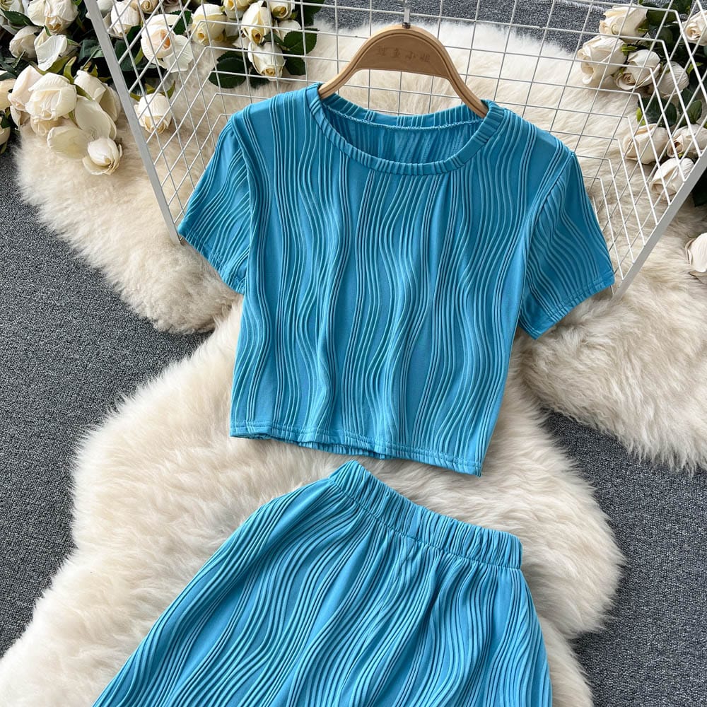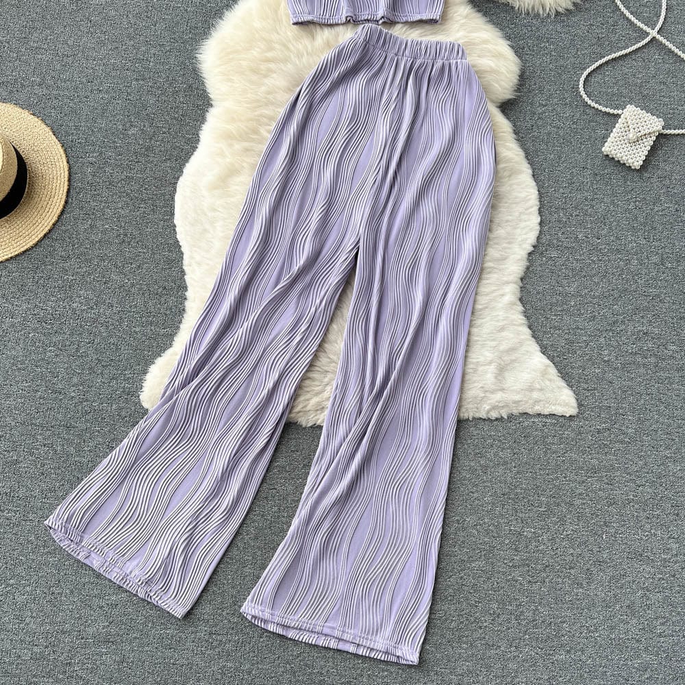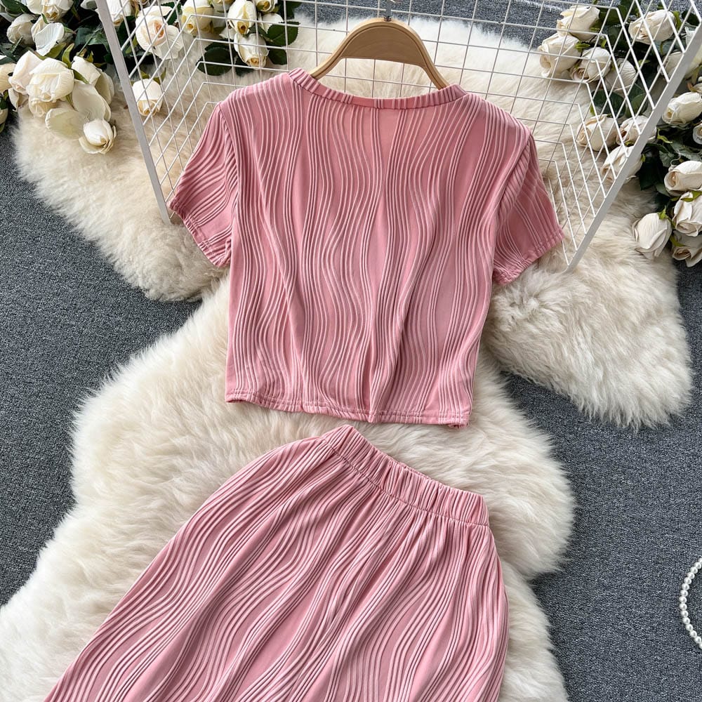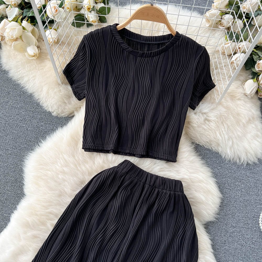Es handelt sich um ein Set aus einem lockeren T-Shirt mit Rundhalsausschnitt und weiten langen Hosen. Es bietet eine entspannte Passform und atmungsaktiven Stoff, der den ganzen Tag über Komfort unter der Sonne gewährleistet. Das minimalistische Design passt nahtlos zu den weiten langen Hosen, die mit einer fließenden Silhouette jede Figur schmeicheln.